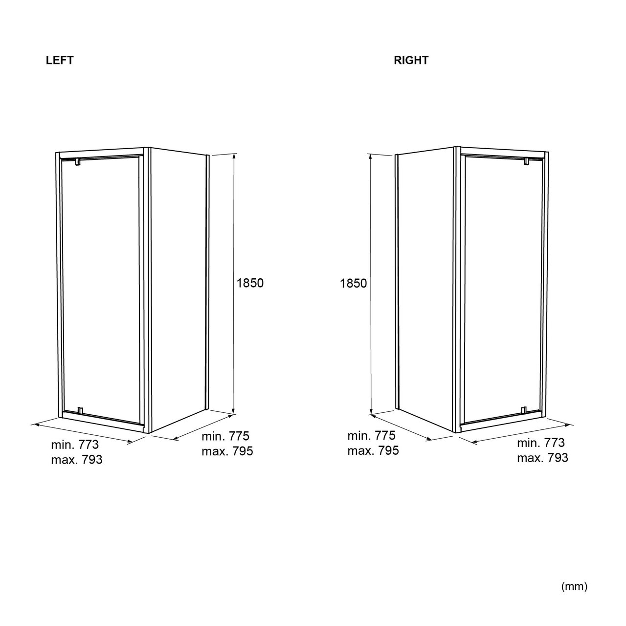 Plage de réglage de la largeur de la porte de douche | 77,5 - 79,5cm x 77,5 - 79,5cm | |