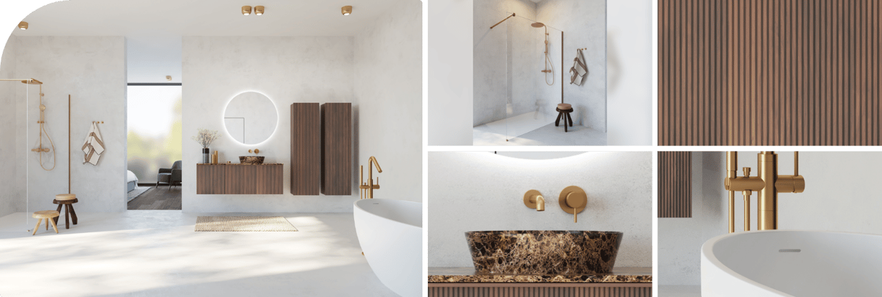 Une salle de bain où le luxe et le raffinement se rencontrent. L’alliance du bois foncé profond, des détails en marbre et des accents en or brossé confère à cet espace une élégance intemporelle. Un mélange parfait entre confort et sophistication, pour une ambiance digne des plus beaux intérieurs.