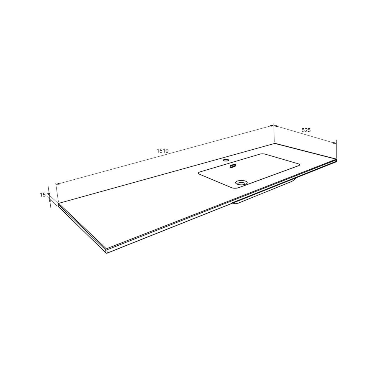 Ce plan vasque asymétrique en marbre composite avec vasque intégrée mesure 150 cm de largeur, 52 cm de profondeur et possède 1,5 cm de hauteur de rebord. Grâce à sa finition épurée, ce plan vasque en Blanc Brillant s'intègrera dans n'importe quelle salle de bain.