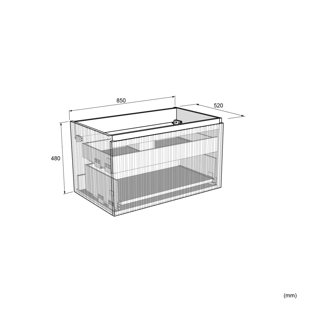 Ce meuble sous-vasque en MDF avec feuille PVC avec 2 tiroirs a une largeur de 85 cm, une hauteur de 48 cm et une profondeur de 52 cm. Ce meuble suspendu en chêne noir convient à toutes les salles de bains grâce à sa finition élégante.