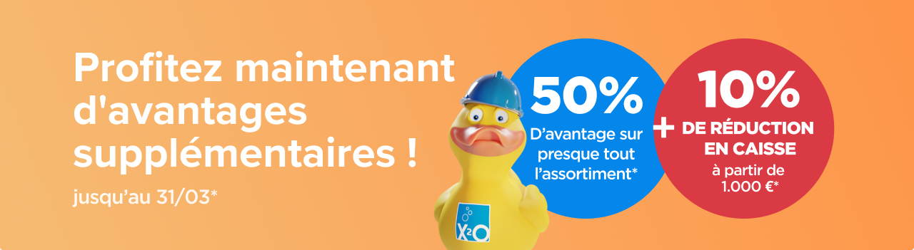 Pendant tout le mois de mars, profitez de 50 % de réduction par rapport au prix conseillé sur presque tout. Et ce n’est pas tout : en plus de cette réduction, bénéficiez de 10 % de remise en caisse dès 1.000 € d’achat.*